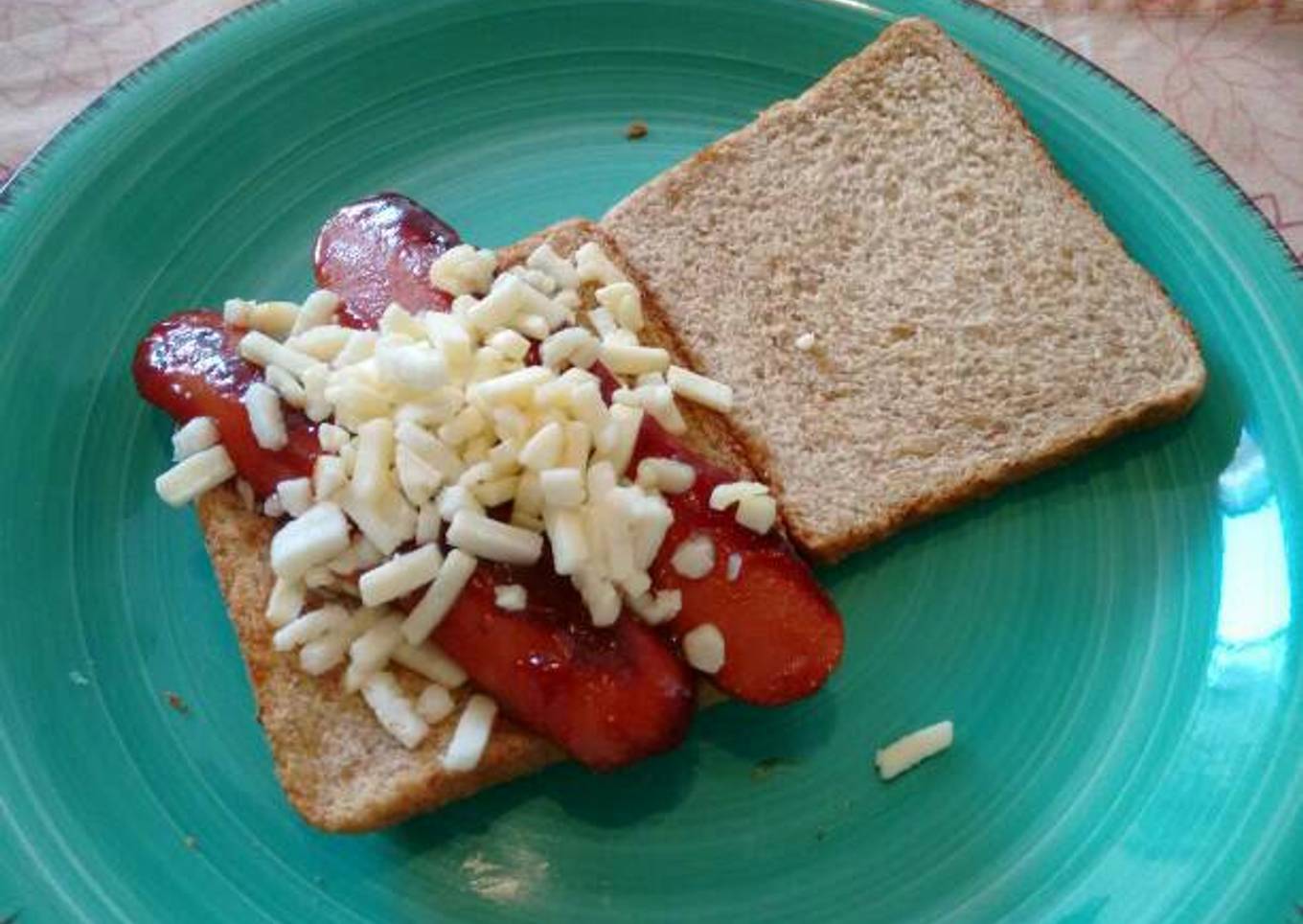 - Coloca salchichas con queso en cada rebanada y cubre con otra rebanada de pan.