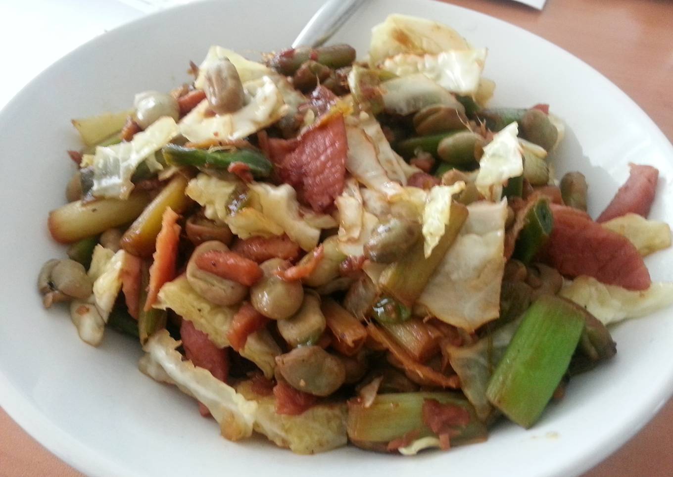 Hoy he llegado tarde de una reunión, eran las tres, no había comida y estaba hambrienta. Por otra parte este mes me he quitado el pan así que bocadillo de atún (mi usual baza de comida rápida) no era una opción. Así que he sofrito unos ajos tiernos, habitas y repollo con unos taquitos de jamón en un poco de aceite, jengibre rallado y salsa de soja. Y pimienta. Rapidísimo y muy bueno!!