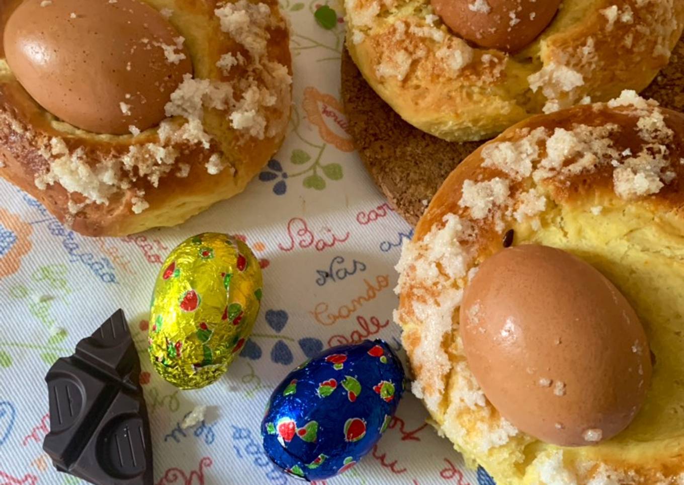 - Hacer 6 bolas de masa. Amasar un poco, pintar con huevo y ponerles el huevo duro en las que queramos hundiéndolo un poco en la mona. Luego poner el azúcar con esencia de azahar por encima y dejar que repose 20-30 minutos y vuelve a levar un poco ya en la fuente del horno