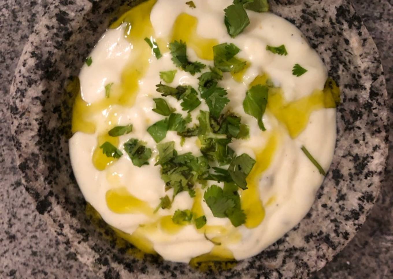 - Vaciar el yogurt, echar la menta picada fina, la mezcla de ajo y pepino, la sal y pimienta, un chorro de aceite y revolver. Decorar con aceite y hojas de su elección, usé cilantro (pero puede ser menta, ciboullete o la que más le guste)
