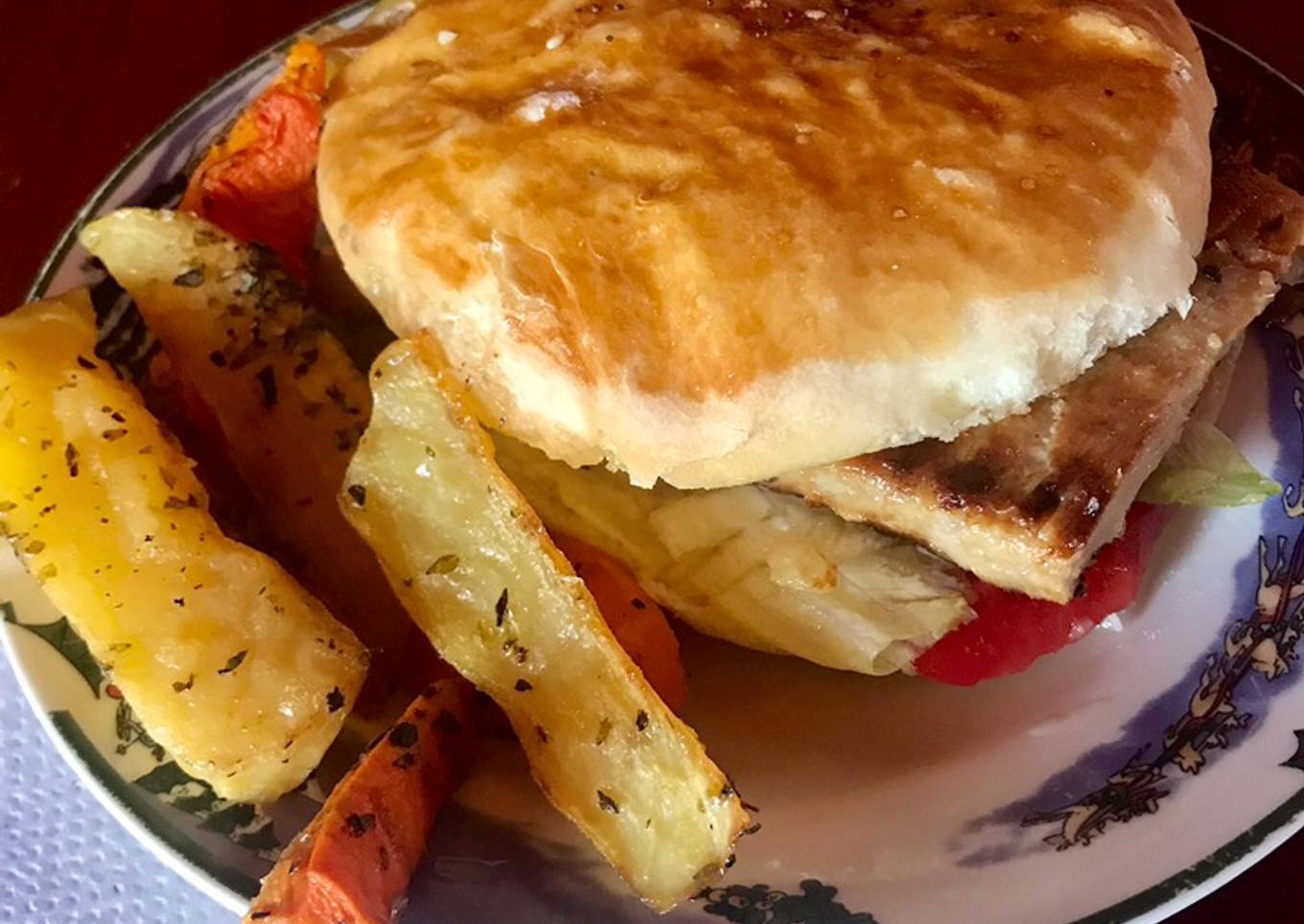 - Cortamos los panes y lo vamos calentando encima de la carne y armamos los sándwich, aclaro que temprano ya había puesto unas papas con zapallo y zanahoria en el horno (les encanta esta preparación)