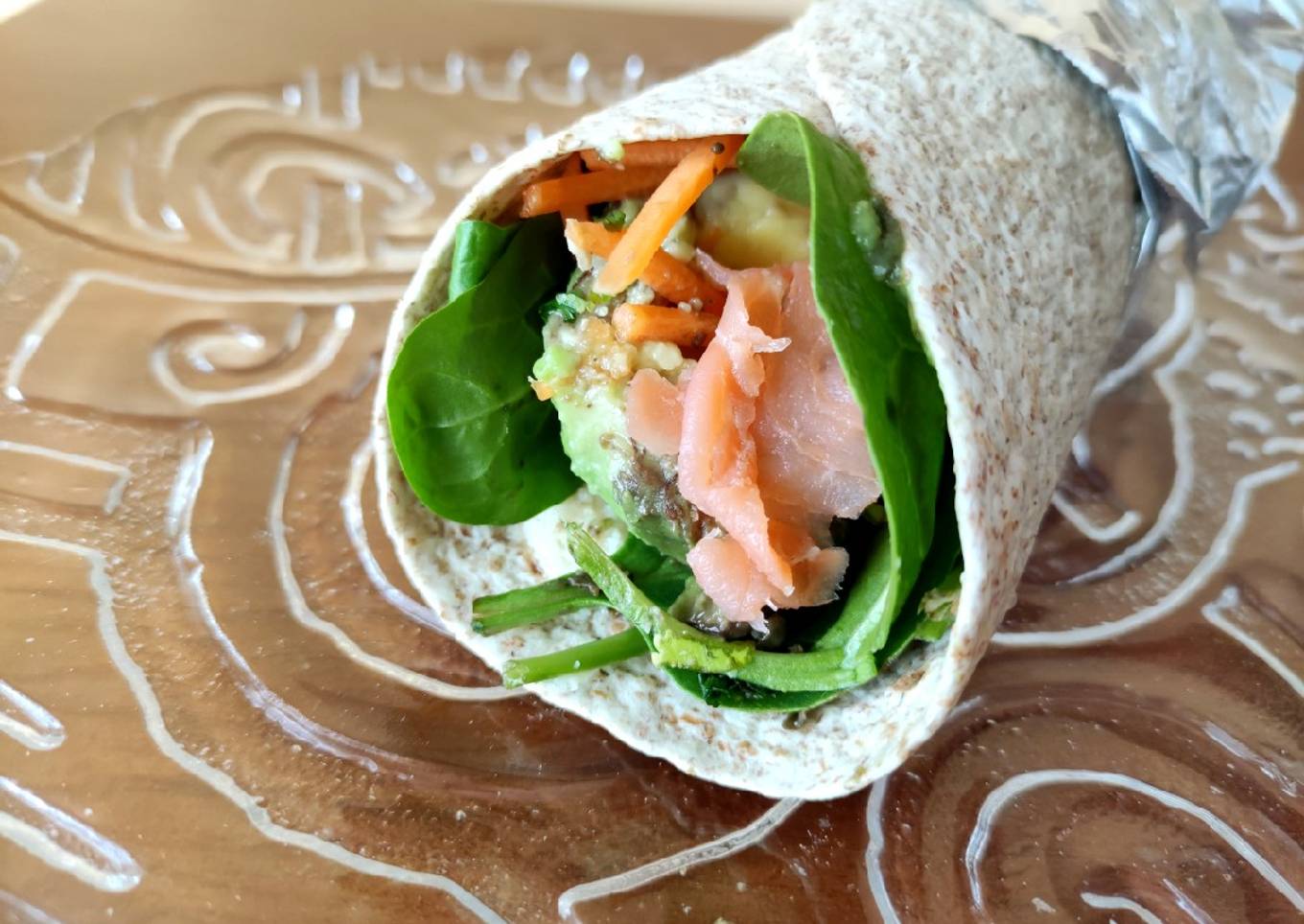 Wrap frío integral de salmón ahumado, queso de cabra y espinacas