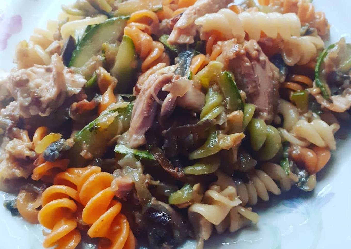 Salteado de verduras con pollo y fideos tricolores đ€€